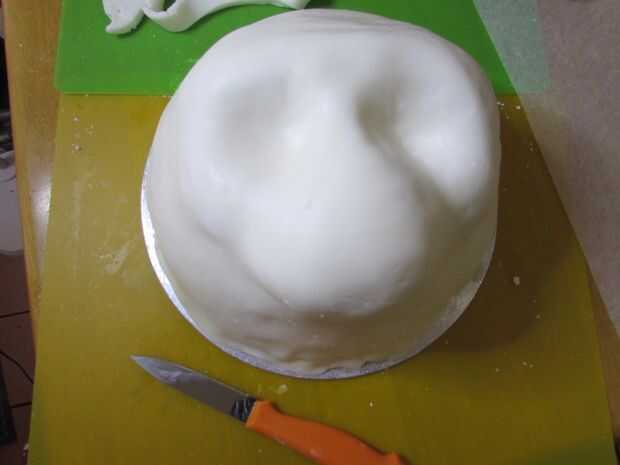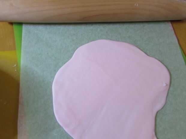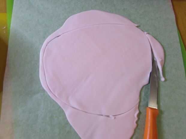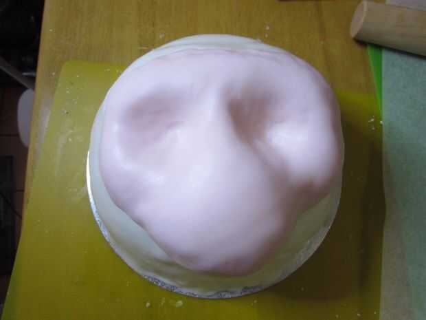 Agregar apenas una gota de gel roja para los adornos de fondant y amasar hasta que el color es un color rosa claro aún. Si no tienes suficientes recortes, usted puede tomar algunos de lo 500 g pastillaje (fondant) para la piel y los ojos. Extienda en una capa delgada y cortar una pieza redonda coloque encima de la torta. Puede recortar los lados para darle forma. Los lados no necesitan ser perfectos ya que iremos añadiendo piel más adelante.