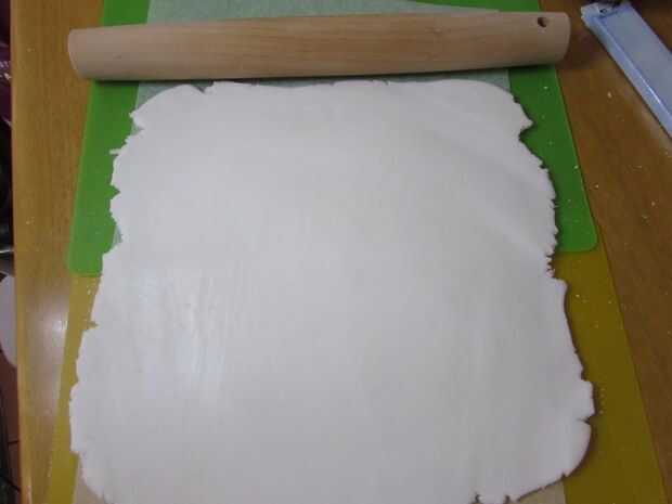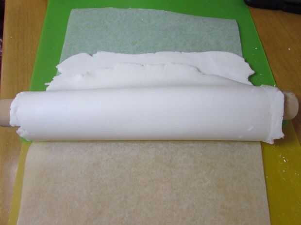 Para evitar que el fondant se pegue a la superficie de trabajo, agregar que una hoja de papel pergamino luego coloque azúcar en polvo en las manos y amasar. Uniformemente como le puede a aproximadamente medio centímetro de grosor entonces da la vuelta un extremo del fondant en el rodillo del rodillo el fondant de 1 Kg desde el centro hacia afuera. Levante el rodillo y coloque con cuidado el fondant encima de la superficie de la torta. La superficie con las manos y cortar fondant sobrante en la parte inferior con un cuchillo.