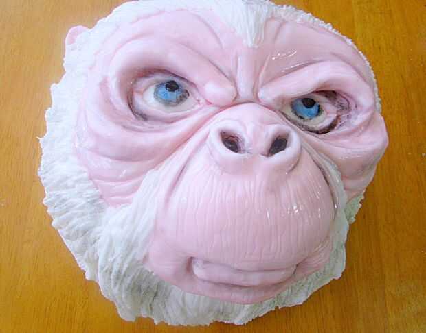 Para la piel, yo rodé el fondant a una cuerda fina y cortar en trozos pequeños. Luego rodó cada uno entre mis manos para hacer una serpiente larga y unida a los lados de la cara y enmarcarlo. También he añadido algunos de piel a los lados del hocico. Luego con una herramienta puntiaguda curvada, sangría las líneas en las bobinas de la piel para que se vea como el pelo y no cuerda-como. También tome nota de la dirección de la piel como usted sangrar.