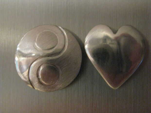 El corazón fue mi piloto y por lo tanto el más simple. El yin y el yang es un poco más complejo - lijar toda la pieza con papel de grano 100, luego con cinta sobre una mitad de la figura. Había pulido el metal expuesto, entonces quita la cinta con la esperanza de tener un contraste entre las dos mitades. Me parece un éxito, pero es muy sutil. Usted puede ver el efecto mejor en la última foto donde se yuxtaponen el corazón y el yin y el yang en la nevera.