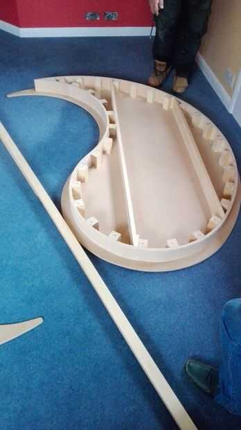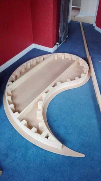 Usando una sierra circular cortar el contrachapado flexible de 100mm (4 pulg) tiras. Esta es la distancia por debajo del techo que va a ser la isla. Te aconsejo usar 3 capas de madera contrachapada flexible para dar un reborde sólido. Utilice un Gramil de corte 65mm desde el borde la forma redonda y 80mm de. La cara frontal de los bloques para formar la madera contrachapada se colocará en la línea posterior. Corte un número de bloques que son 100mm de alto y utilice un avión para eliminar las esquinas, el borde exterior, esto es para que el área de contacto de la capa se reduce lo que significa que la curva se verá lisa en lugar de bloques. Los bloques en lugar de tornillo y pegar la primera capa de capas flexibles en lugar, abrazadera y dejar para secar. Hacia los puntos del ying yang, se reunirán los extremos de la madera contrachapada, esto debe hacerse en la forma de una mitra. La siguiente capa de madera alrededor del pegamento anterior y la abrazadera de la curva. repetir este proceso para la capa final, que debe estar a nivel de la línea es de 65mm en el borde. Cierren el ying y el yang por usar dos maderas 4 "x 1" en el medio del ying y el yang, estos también pueden ayudar a proporcionar puntos de extra fijación.