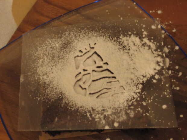 5. Sostenga sobre el brownie y la plantilla y golpee suavemente el costado