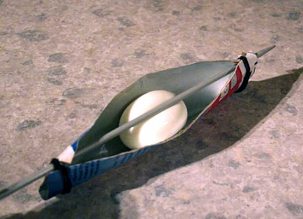 Coloque el huevo en el redil y suavemente presione una aguja de tejer o redondo palillos (de nuevo, lavada!) a través del huevo y seguro con goma bandas en cada final del papel.