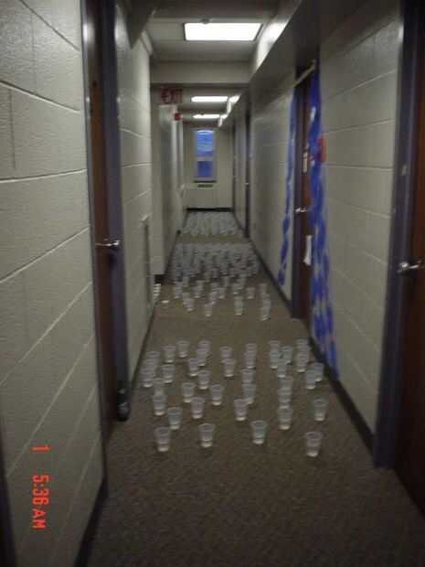 En pocas palabras, llenar cada vaso con agua (a mitad de camino es bueno) y colocarlos juntos en el piso de la zona que se desea obstruir.  Más cerca juntos, mejor.  No deben ser capaces de paso entre las copas (o al menos no fácilmente).  Su prankee debe encontrar el conjunto hasta contemplar con asombro y rápidamente cambiar a la molestia cuando se dan cuenta que tienen cientos de diminutas tazas de agua a llegar a su oficina/dormitorio/baño etc..