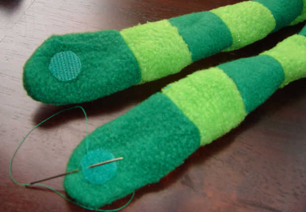 Brobee tiene brazos largos, quería tener sus brazos envolver la parte trasera de mi pie con pequeños trozos de Velcro en las manos.