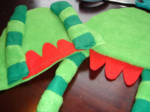Tomar el material que corta la parte del dedo del pie de la zapatilla y añade sentido de naranja tres triángulos para sus cuernos. También añadir los brazos y coser éstos en su lugar. En la imagen, puede ver cómo se cose y lo que parece doblado detrás, lado derecho hacia arriba.