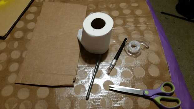 Necesita una hoja de cartulina, lápiz, rollo de papel higiénico, tijeras, cinta de pato.