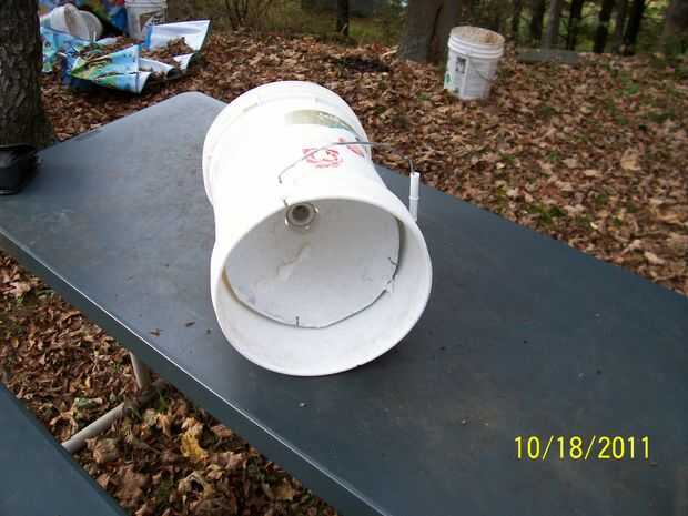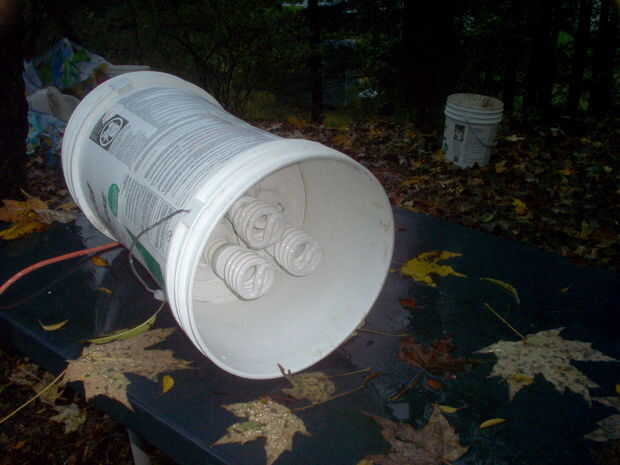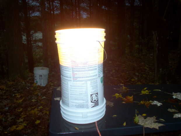 Primero intenté poner una de aluminio luces sombreadas en un cubo de plástico de cinco galones, corte la parte inferior parcialmente hacia fuera hasta la luz hacia abajo en él cómodamente, cableado en su lugar y colocar un palito al lado para ponerlo abajo y moverse en zancos.