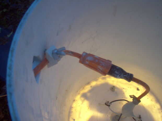 Esto fue bastante bueno, pero la bombilla era todavía vulnerable, así que la próxima traté de cableado de la luz en la parte inferior del cubo como antes y corte la parte inferior de otro cubo y jamming cómodamente en la primera como una especie de sombra y protector de la bombilla, usando la manija existente en lugar del palo. Mejor, pero luego pensé, "¿por qué no utilizar las mejores propiedades de los nuevos tubos fluorescentes para mejorar su luz?" Por lo tanto...
