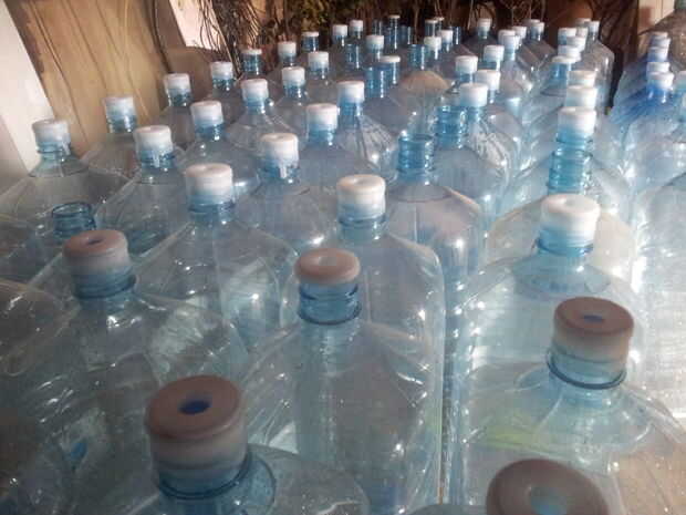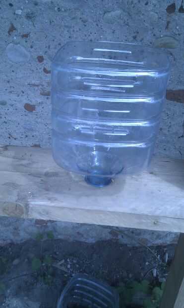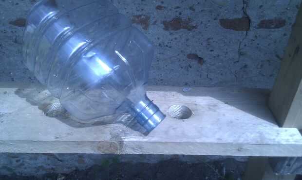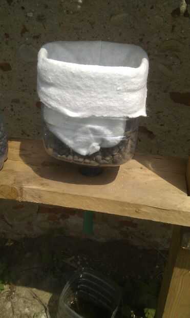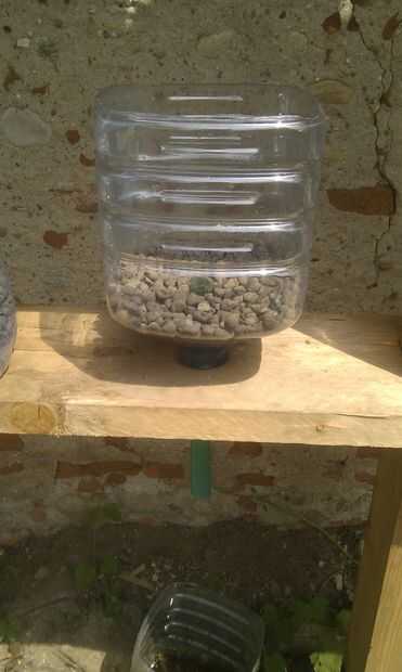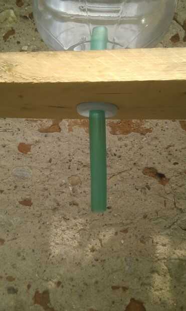 Para obtener una pequeña reserva o agua en la maceta he utilizado un trozo de tubo de pvc (diámetro de 4 cm) en el cuello de la botella con bandas de goma, pero después de que algunos tratan de que descubrir una mejor manera de hacer el trabajo, usando la tapa de plástico de la botella y un pedazo de manguera.