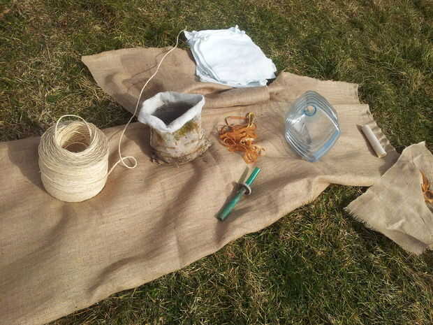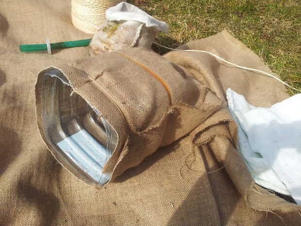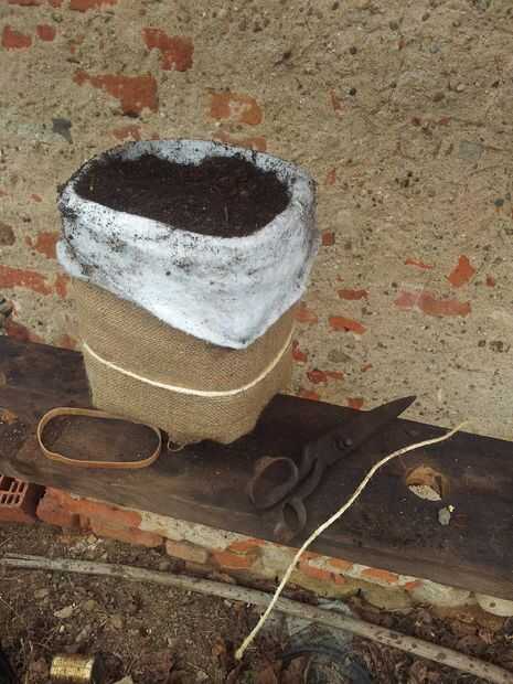 Para proteger la botella del animal doméstico y las raíces de la luz directa del sol, corté una juta neto, encontrado en ebay por pocos euros. Este material natural darle la botella un aspecto rural/vintage. Para sostener la malla usé un cable de juta.