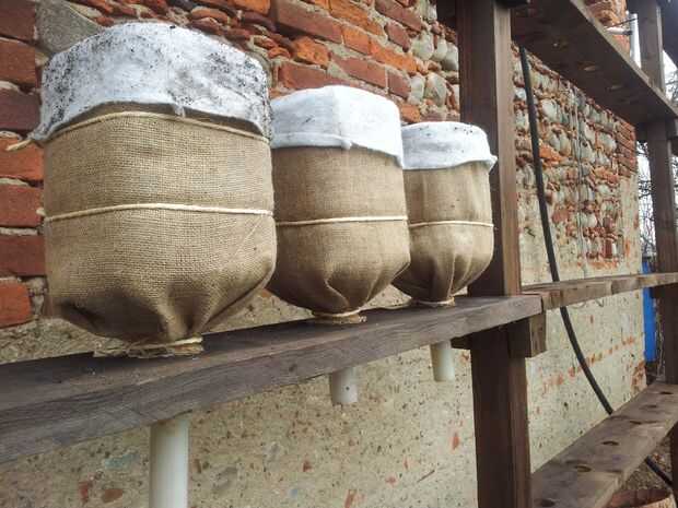 El prototipo del plantador era una botella cortada con 1/3 de arcilla expandida y 2/3 del suelo. Para evitar la mezcla de la arcilla, decidí usar fieltro bolsas cosen de una alfombra comprada en internet. Esta solución crea un espacio de aire entre la pared interna de la botella y el suelo, agregando algunos aireación al sistema. Este bolso es reutilizable y permiso para remezclar el suelo después de cosecha.