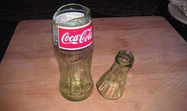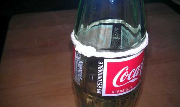 Primero corte una longitud de cadena lo suficientemente larga para envolver varias veces alrededor de la botella. Luego envolver la botella con la cadena en el punto donde desea cortar la botella y haga un nudo. Quite la cadena y déjelo remojar en acetona (se puede utilizar removedor de esmalte de uñas). Luego envolver la botella con la cadena otra vez. Para este próximo paso Asegúrese usted tiene su baño de agua fría preparada y cerca de la botella. La cadena de luz en el fuego y rotar la botella asegurándose de que concentrarte suficiente calor alrededor de toda la circunferencia de la botella. Dejar quemar hasta que la llama comienza a morir y caer rápidamente en el baño de agua fría. El cambio rápido de temperatura agrietará la botella donde estaba envuelta en cadena.
