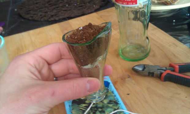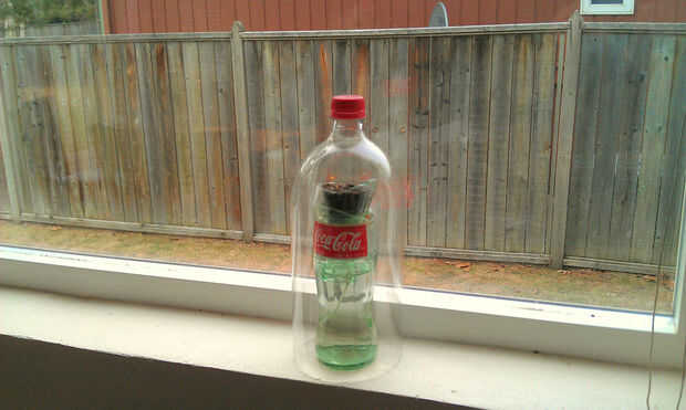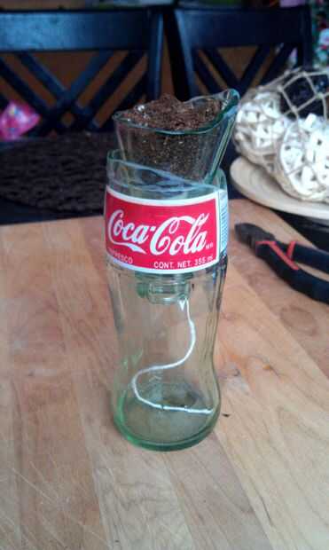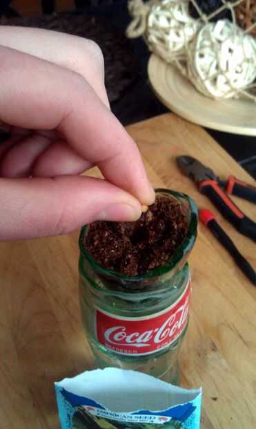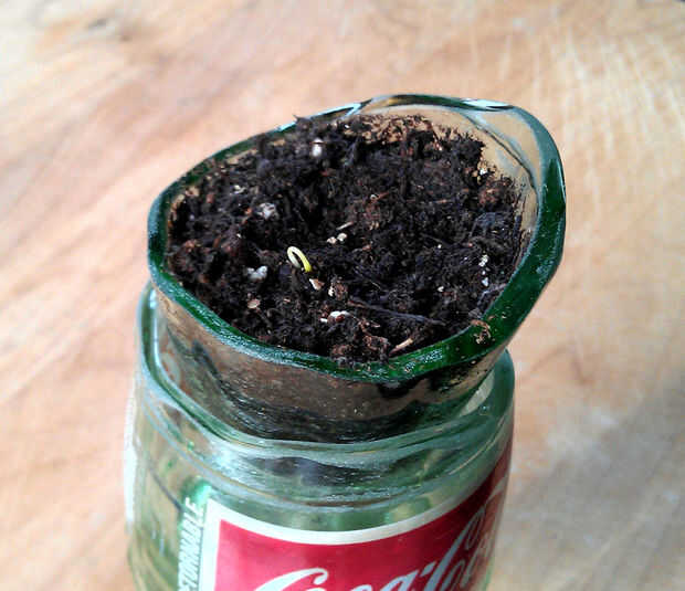 Ahora que la botella está lista es hora de añadir agua, el suelo y la planta de tu elección (planté Cilantro). Primero añadir agua a la parte inferior de la botella. Hacer esto mediante la adición de agua directamente a la base, no a través de la parte superior. A continuación añadir el suelo a la parte superior de la botella y cualquier trasplante o coloque una semilla en el suelo para crecer. Todo hecho, ponga su planta en un alféizar soleado y disfrute de su uno de una sembradora de botella drenaje tipo!