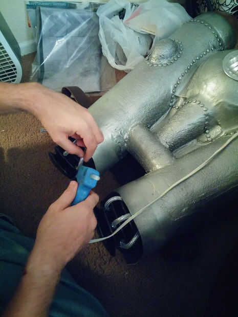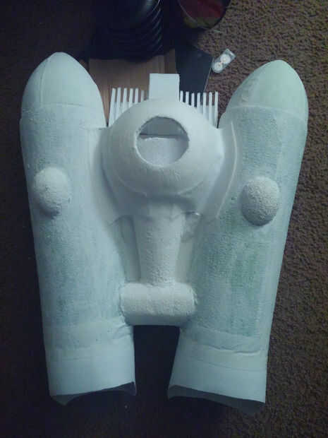 Dave de la construcción lo hizo mientras estábamos en Hawai, lo debo grande para eso. Dave tuvo un rodillo de espuma que tenía colocación alrededor y corta el lechón en la mitad. Él hizo lo mismo a un fútbol de espuma pegado a la parte superior de los rollos y fabricación de cohetes. Cortaron el mango de émbolo y recortan fondos, hay nuestros motores. Formas de espuma de poliestireno (cono y cúpula) pegados a cada lado de los cohetes y un trozo de tablero de la espuma agrega estabilidad a llenar la sección de centro. Utilicé papel para hacer un patrón de otras piezas necesarias y cortamos aquellos fuera de la misma espuma que se utilizó para el casco. Para hacer los remaches/marcas de soldadura se utilizan latón pequeños clavitos y presiona en su lugar. (bono para el uso de espuma, hizo la parte más fácil) Que caliente había pegado la mierda de esta cosa y entonces utiliza para calafatear a pasar por encima de todo, suavizar bordes y tratando de mezclar todas las piezas. Debido a las diferentes texturas decidimos capa lo en plastadip sería una forma de unificar la textura, sin embargo plastadip corrosivo reaccionó a las piezas de espuma de poliestireno cuando lo probamos. Así que, para luchar contra eso, nos recubrirse la cosa con la masilla y una vez seco el maridito rociado lo en ambos lados con el plastadip. Una vez que estaba seco comenzamos las capas de pintura de plata y acabado con una capa de cobre en las cimas de los cohetes. Había atornillado de los émbolos y añadido la cinta trenzada para parecerse a los cables de conexión para los motores de cohete.