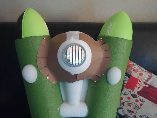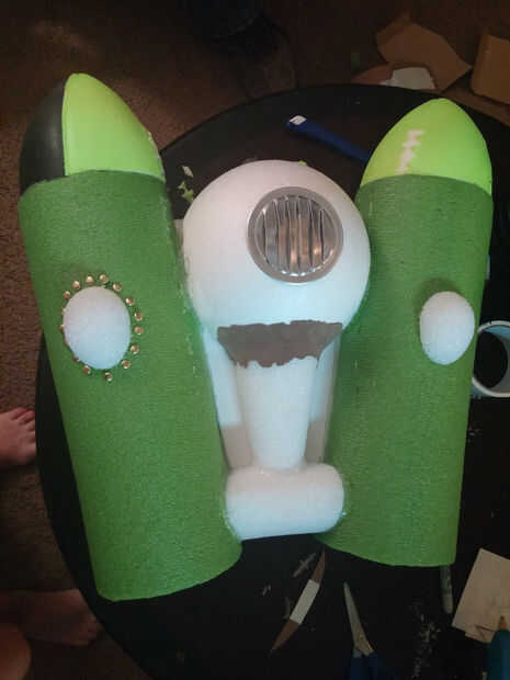 No es perfecto por cualquier medio, recortar algunos de los detalles que quería hacer porque estoy Cruncheando a tiempo, siendo sólo 2 días antes de Halloween y 1 día antes del concurso de disfraces de la empresa. (No creo que lo coloque pero voy a hacer un buen espectáculo) Las aletas en el punto medio de los conos no se realizan, las aletas en la parte inferior de los cohetes no se realizan, el botón de control de mano y el cable no se hacer y no tengo tiempo para hacer el sobreguantes que dicho botón y el cableado. Pero es maldito y, para un total noob en este tipo de cosas, es bastante bueno.