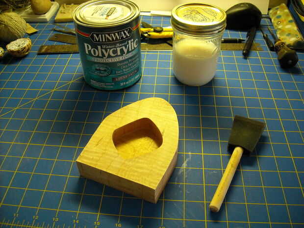 Dejo que la pieza seque por unas horas antes de aplicar cualquier selladores. Yo siempre uso uretanos a base de agua. Son fáciles de limpiar y seguro de usar en mi apartamento. Generalmente aplico 2 capas lijar con 400 mojado seco lija entre capa y capa. En este caso estoy usando un producto de acabado satinado Minwax y facilidad de uso, decantó en un tarro de cristal. Yo siempre uso un cepillo de espuma para aplicar uretano.