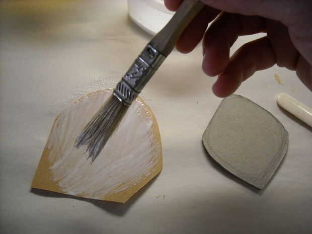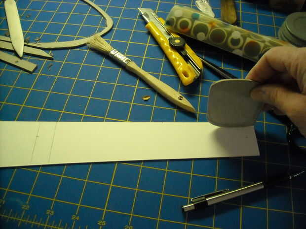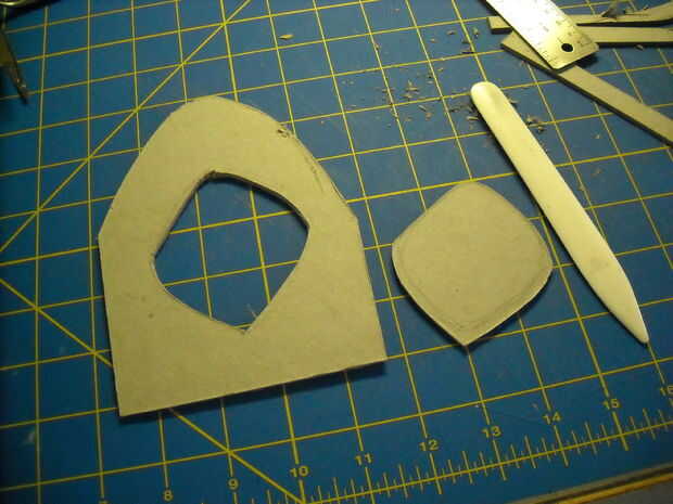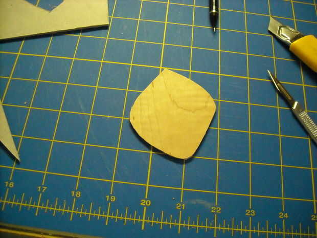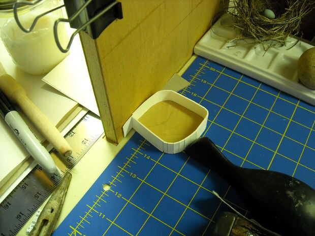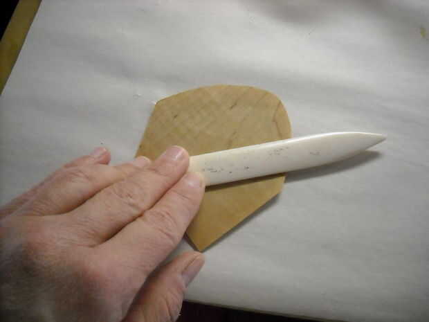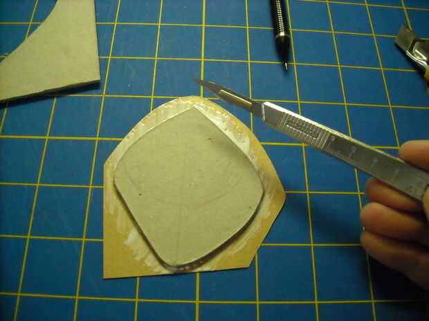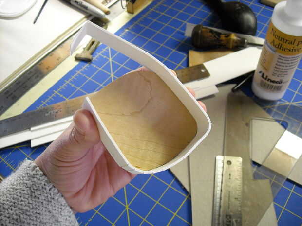 Este trabajo tiene una cierta asimetría a él así que he decidido que la forma de centro tendrá una calidad orgánica similar. El trozo que he cortado se convertirá en el piso de la cámara, por lo que no es lanzado lejos. Además, he encontrado que es mejor aplicar la chapa esta parte antes de pasar. Después de que las paredes de la cámara han sido creadas es mucho más difíciles cortar con precisión la chapa para. Yo siempre uso un pincel para aplicar el pegamento, luego utiliza una plegadora, Pula los la chapa para asegurar un enlace apretado. Luego, cortar el exceso.