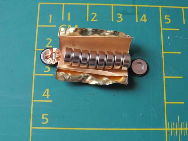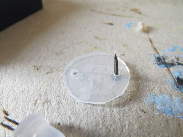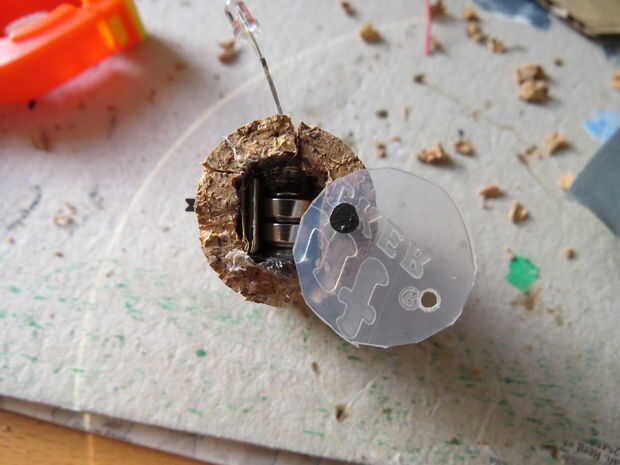 Para hacer la tapa, cortar un disco de plástico resistente o de tarjeta, hacer un agujero a través del lado y coloque el disco en la parte inferior del corcho con un clavo. Así, puede quitar fácilmente las pilas girando alrededor del disco.