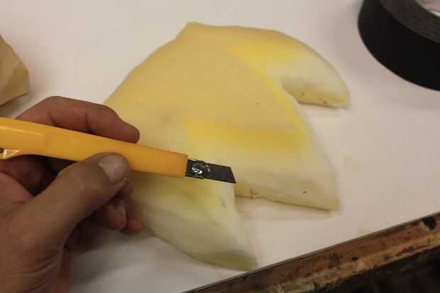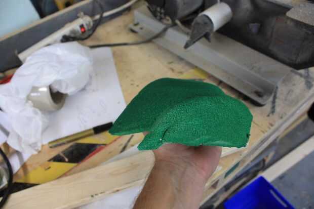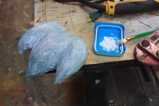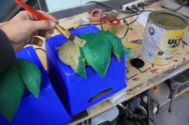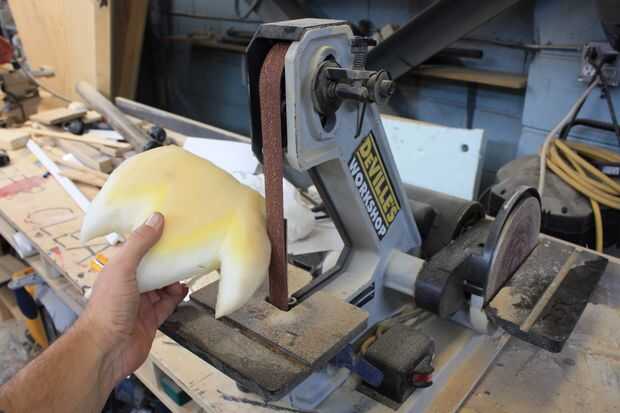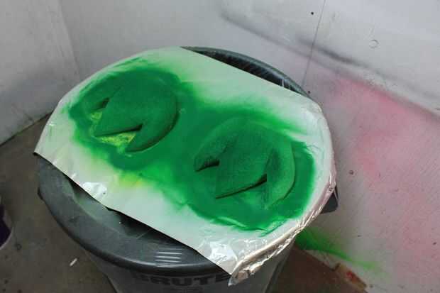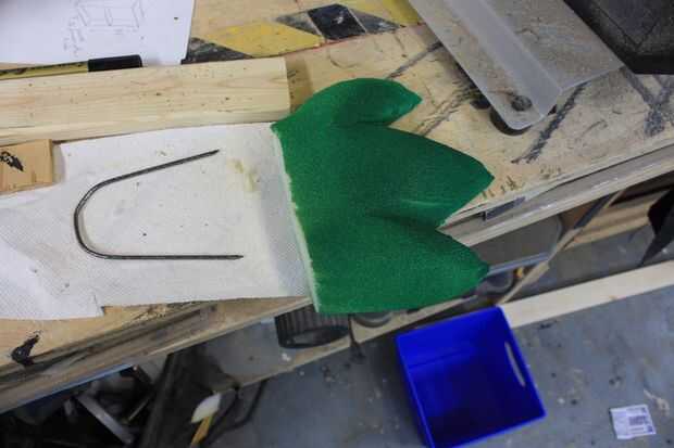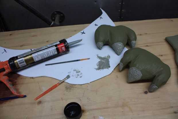 Usé un cortador de la caja y cortar la forma básica de espuma de colchón. Luego alisó hacia fuera los bordes irregulares en mi lijadora de banda. No me gustó cómo recta los dedos del pie eran así que insertar unas barras de metal finas y había doblado, que dobló los dedos del pie bien. Aerosol pintado los pies con la cartilla, y luego con pintura verde.