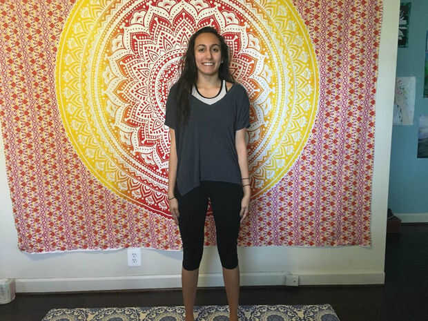 Comience de pie con su pies hasta los hombros separado y los brazos a los lados. Tomar una respiración.