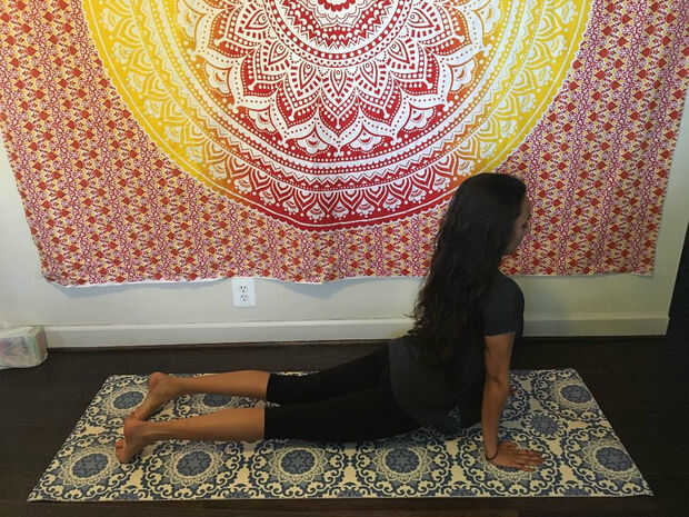 Del chaturanga, en la inhalación elevar solo los brazos para levantar la mitad superior de tu cuerpo entrar en perro hacia arriba. Trate de no dejar que los muslos toquen el suelo, pero pasa nada si lo hacen!