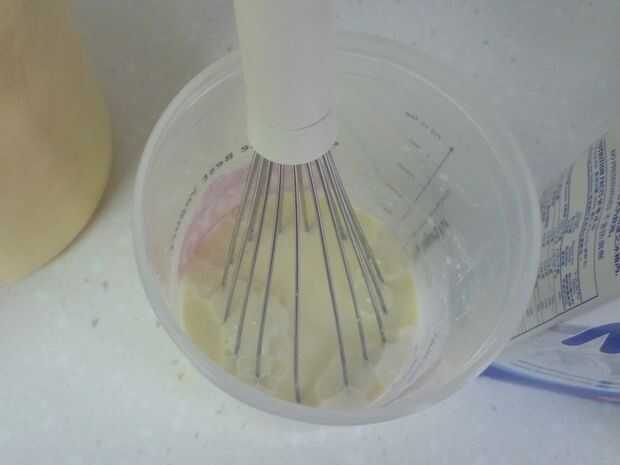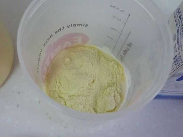 Vierta aproximadamente la mitad de la leche en el pote de yogur. Para espesar la leche y producir yogur más gruesa, agregar cuatro cucharadas redondeadas de leche entera en polvo (otra vez ajustar al gusto, más hace más grueso, menos hace yogur más fino).