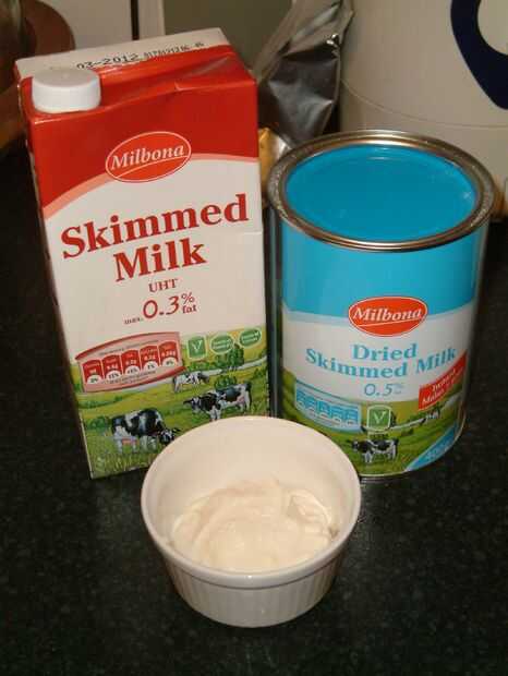 4 cucharadas de polvo seco de leche desnatada. Esto hace que sea más grueso, se podría utilizar menos