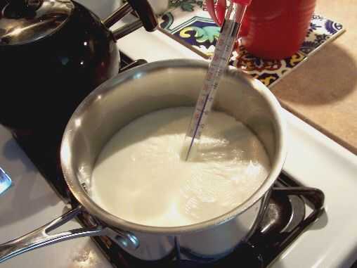 Vierta la leche en una cacerola mediana. Inserte el termómetro de caramelo para que se sienta en la leche sin tocar el fondo de la cacerola. Sobre fuego medio, caliente la leche hasta que el termómetro Marque 180 grados Fahrenheit. La radicó puede empezar a burbujear, pero no debe hervir!
