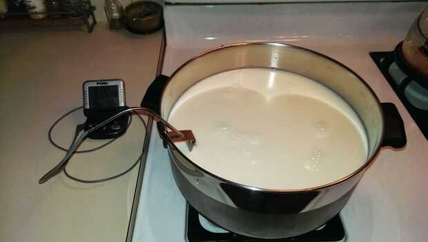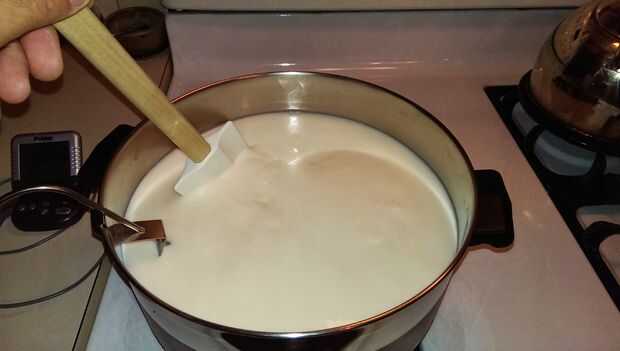 - Vierta el resto de la leche en la olla y coloque el termómetro sobre el fondo de la cacerola.