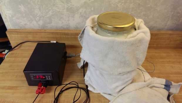 Una vez que el regulador de temperatura, es cuestión de colocar la sonda de temperatura para la jarra, envolviendo la esterilla alrededor de la jarra y liando en toallas para el aislamiento. Ahora puedo conectarlo y olvidarse de ella hasta que haya completado el proceso de incubación. Generalmente objetivo para después de la cena para poner para arriba una nueva tanda, así que está listo para descansar lo primero en la mañana.