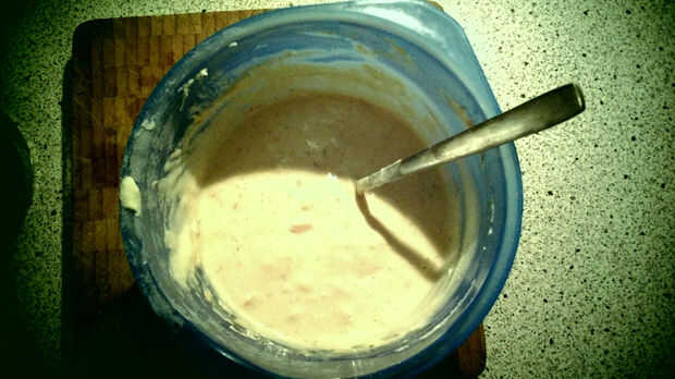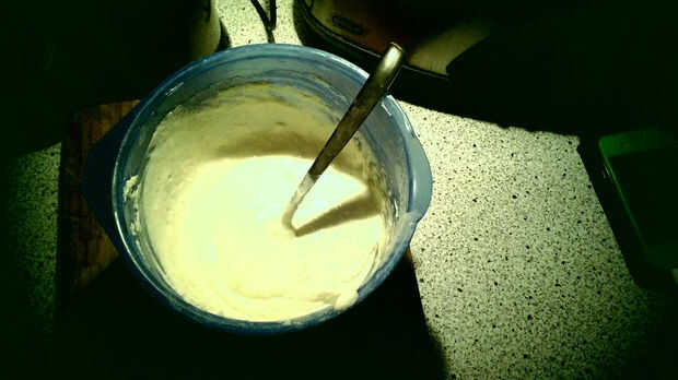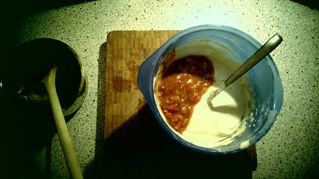 Tomar un bol mediano y Mezcle harina, polvo de hornear, yogur, huevo. Esto funciona con un solo tenedor, así como con una batidora de mano eléctrica. Aunque si no tienes uno, puede mezclar los ingredientes secos primero, luego añadir a los yogures y batir en el huevo para asegurarse de que obtener una masa homogénea.