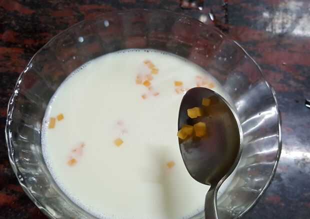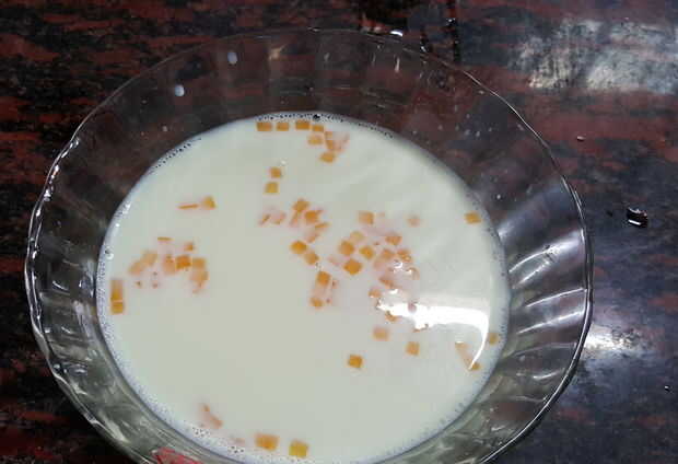 Añadir en el cubitos de papaya. Puede utilizar cualquier fruta aquí. Manzanas, pera todo lo que viene a su mente. Mezclarlo bien.
