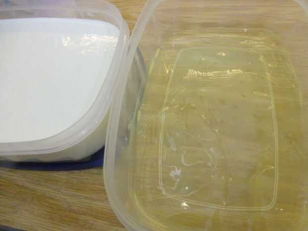 Cubrir los orificios con 2 filtros de café. El recipiente superior se encuentra en el recipiente inferior. Luego eche en el yogur. Pero no todos.