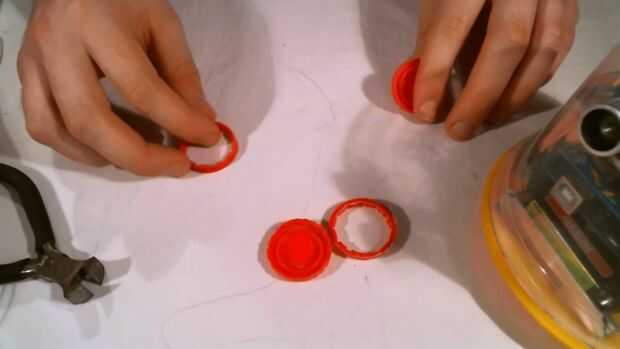 Coge los dos extremos lisos de las tapas de botella de Coca Cola y pegamento caliente en la parte inferior de tu robot.