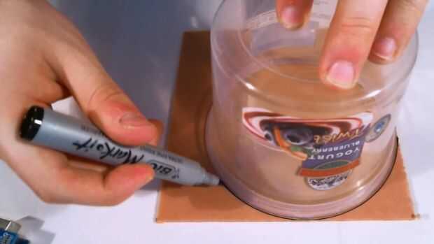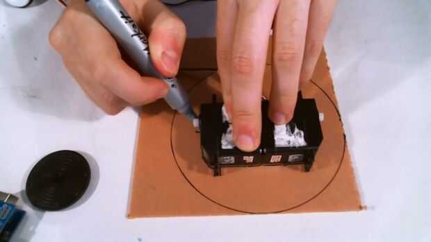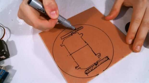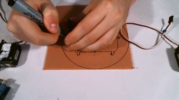 A continuación coge los cuernos servo circular y marca a su alrededor. Ello, porque vamos a tener que cortar los agujeros en la base para permitir que las ruedas empujar a través. Asegúrese de que tiene suficiente espacio y marcar los agujeros que usted necesita para cortar.