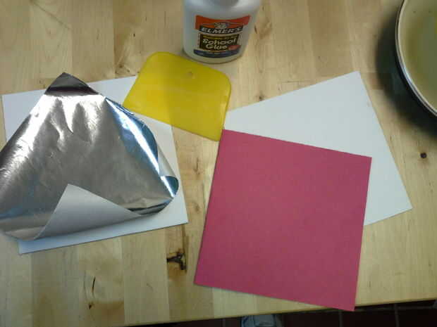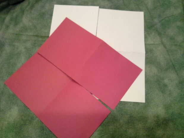 Hacer base para cocina solar cortando una plaza extra rojo 12" cuadrados y blanco 12" en medio. Doble cada uno en 6" cuadrados. Tienes 2 rojo 6" cuadrados y 2 blanco 6" cuadrados. Pegue ambos cuadrados rojos juntos para hacer una pieza de 4 capas y ambos cuadrados blancos juntos para hacer una pieza de 4 capas diferentes. Pegar el papel a 1 lado de blanco 6" cuadrados.