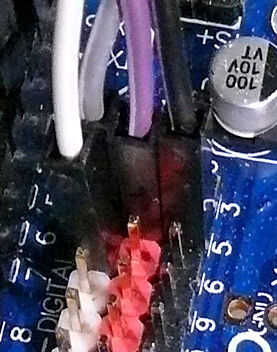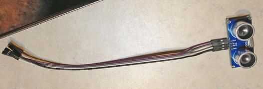 Conecte 4 cables del cable del arco iris, (usamos púrpura, gris, blanco y negro) a la base del sensor ultrasónico como esta: