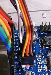 Ahora Conecte el servo en el Robo1. El conector de servo simplemente se conecta en el conector de 3 pines Robo1 etiquetado 11. (Cable marrón se conecta a negro pin, pin rojo con rojo, amarillo con conector blanco)