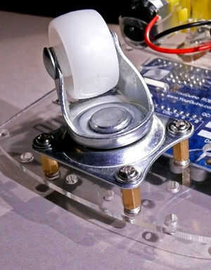 Compruebe hacia fuera los agujeros colocando la rueda en la parte inferior del chasis para ver que 4 agujeros alinean con él. Ahora, coloque el metal 4 'separadores' poniendo larga 10mm tornillos de la parte superior del chasis, a través de los 4 agujeros y en uno de los extremos de los separadores. Sostener los separadores y apriete los tornillos con un destornillador Phillips pequeño. Alinee los agujeros de la rueda rueda con los 4 separadores y fije con 4 tornillos pequeños que tienen grandes cabezas planas. Sugerimos que esperar hasta más tarde para unir las ruedas. Es más fácil de probar el cableado y el software cuando el robot no puede tratar de escapar :-)