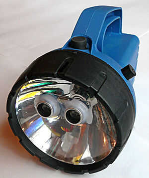 El HandBat terminado (arriba) contiene el soporte YourDuino/Arduino del microordenador y la batería dentro de la caja de la linterna, el Sensor ultrasónico montado en el frontal del objetivo y la alarma en el exterior de la caja.
