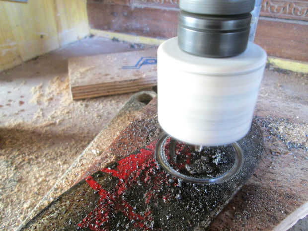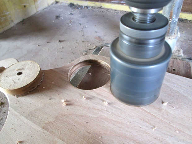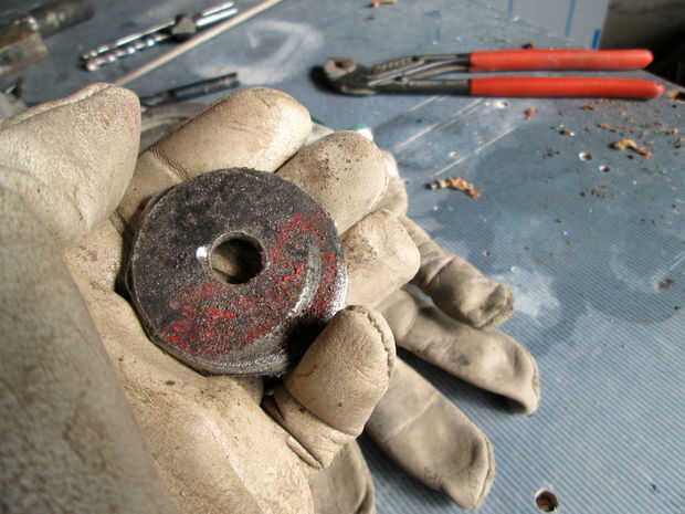 Tenga en cuenta el agujero de 12mm en el centro de las 3 arandelas. Incluso con la llamada 'baja calidad acero todavía es todo menos un chiste para hacerlo. Comenzar con una broca de 5mm. Luego 6, 7, 8, 8.5, 9, 9.5, 10, 10.5, 11, 11.5 y luego, finalmente, el 12. Lubrify tanto como usted puede, usted necesitará.