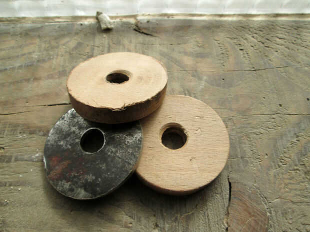 Hice los discos de madera de una tabla de cortar barato. Mayoría de las veces hacen los tableros de haya muy bien y tienen un espesor bastante bien (10mm). Grandes cosas para pequeños proyectos.
