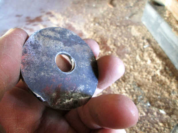 La arandela de acero al carbono es otra historia. En mi proyecto de Carver loco había sido capaz de perforar un buen agujero en un viejo machete con un taladro de reloj - fácil - y decidí hacer esto simplemente otra vez.