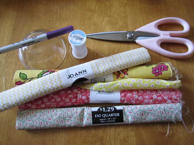 Para este chaleco necesita tela básica de algodón. Compré mina en cuadrados más pequeños de cortadas porque eran baratos y me permitió obtener varios patrones diferentes. Elegí rosa y amarillo como mi principal colores debido al cambio de estación a primavera! Usé un yarda y media de tela para mi chaleco. Usted también necesitará tijeras, hilo de rosca (yo usé abrigos y deber Dual Clarks), algo a rastro y un objeto circular, utilicé un pequeño cuenco que es aproximadamente 3 1/2" de diámetro. El diámetro de los yo-yos será aproximadamente la mitad de los círculos que se desconectará.