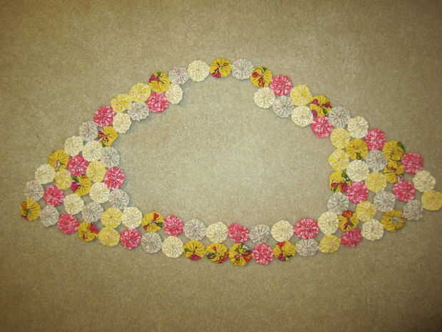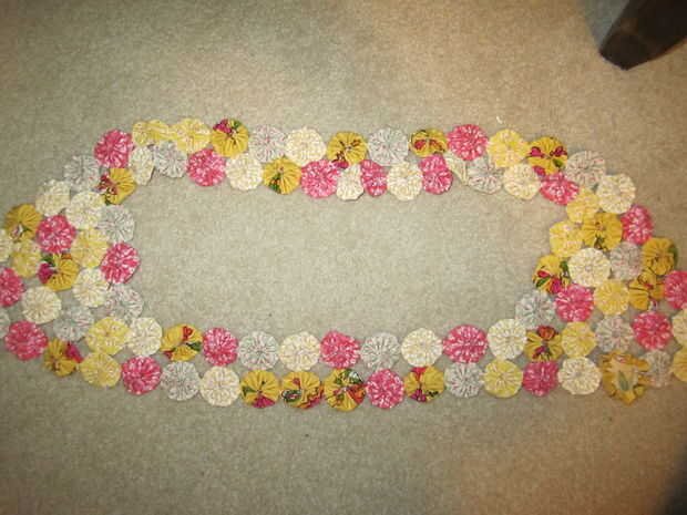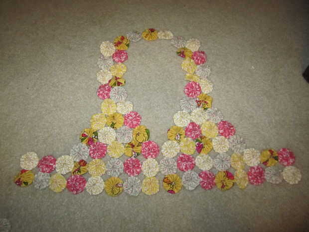 Cuando he terminado de hacer las dos piezas delanteras conecté el interior filas de Yo-Yos en cada una junto con la adición de tres yo-yos. Fueron cosidos en un poco de un ángulo para crear un arco. Esto se hace fácilmente poniendo sus piezas planas y poner a coser luego donde se unen dos círculos. Las filas exteriores de las correas luego recibieron yoyos adicionales dejando un espacio antes de que se les unieron. Los lados del chaleco se alargó para que cabrían alrededor de mi cintura y se unieron juntos dejando el chaleco en una forma extraña y sin respaldo. En la brecha de la correa del cuello del chaleco he añadido seis yoyos, esto quiere decir para siempre uno en la primera fila que he añadido dos. Esto es para ayudar a la forma del chaleco porque tiene una curva más grande para hacer cuando usted lo usa.