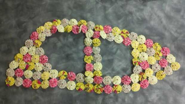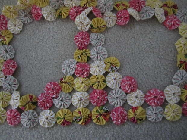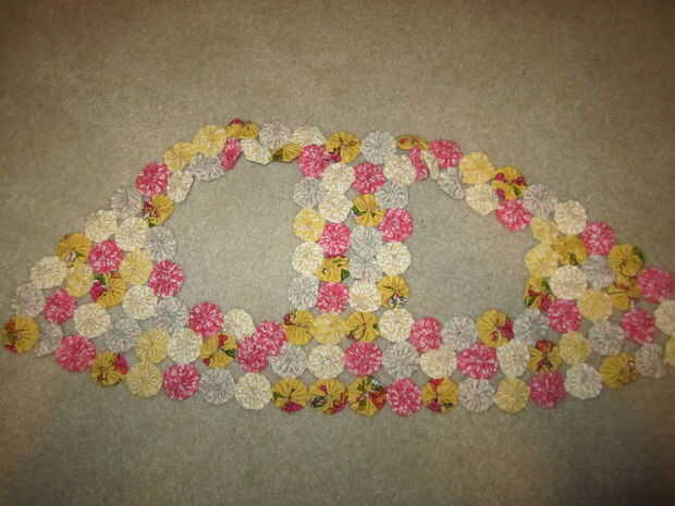Para hacer el hallazgo posterior el centro correa y el cuello hizo y el centro de las líneas de fondo de Yo-Yos. Solía yo-diez yos, dos columnas de cinco, fije la parte superior e inferior. Esto puede variar, probar en su chaleco y un amigo (en mi caso mi hermana) ver el número de yoyos necesita nalgas la brecha. Después de hacer una línea de centro me agrega una columna a cada lado e hice mi mejor esfuerzo para hacer un borde redondeado suave.