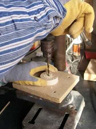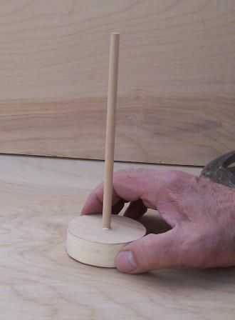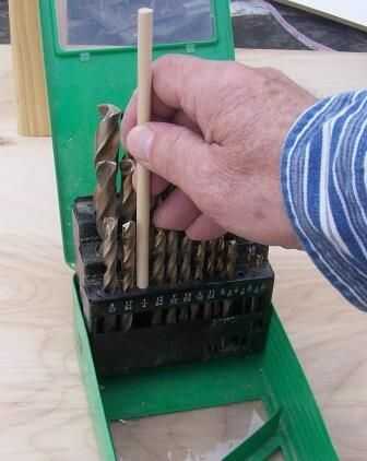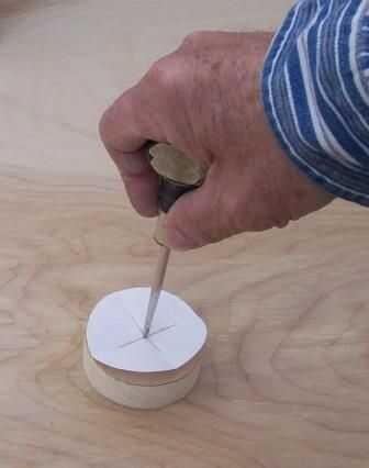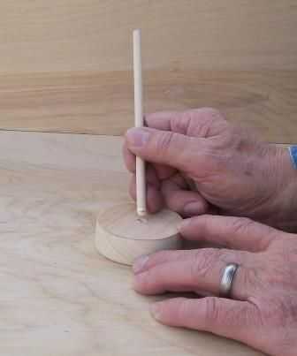 Después de haber establecido el centro de la madera. Perfore un agujero del siguiente tamaño más pequeño y luego el pasador. Colocar una muy pequeña cantidad de pegamento para madera en el extremo de la espiga y unidad en la madera con un martillo. Esto tiene que ser ajustado porque esto tomará mucha fuerza g.