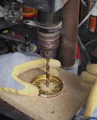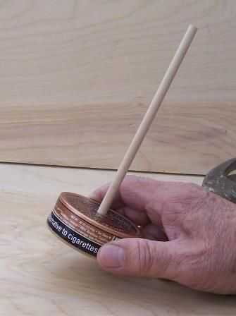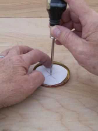Usando su marca de plantilla y una lezna o punzón el centro de la tapa luego perfore un agujero apenas un poco más grande y luego la espiga.