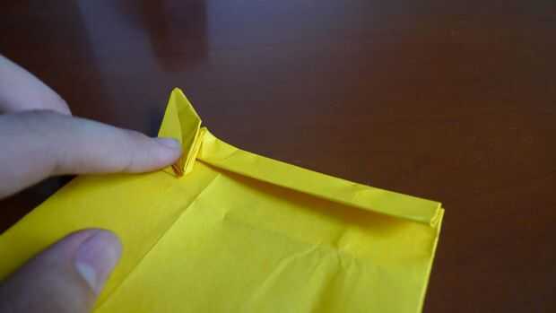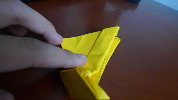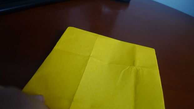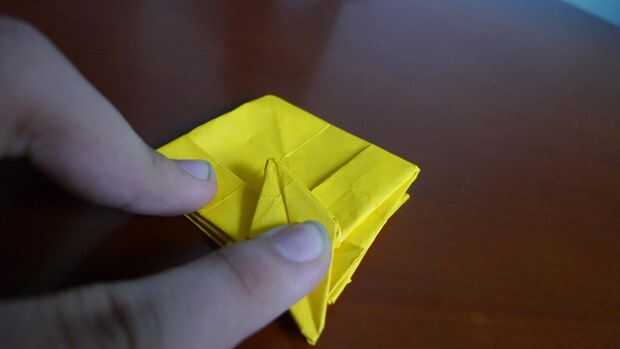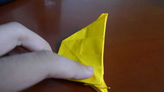Turn back the paper. Plegar el papel, dejar 1 cm desde el punto medio (igual anterior).  Doble hacia abajo los lados derecho e izquierdos. (ver imagen). Vuelta el modelo, doblar la mitad hacia abajo. Dóblalo a la mitad otra vez a la derecha. Doble la calabaza y hacer una base preliminar.